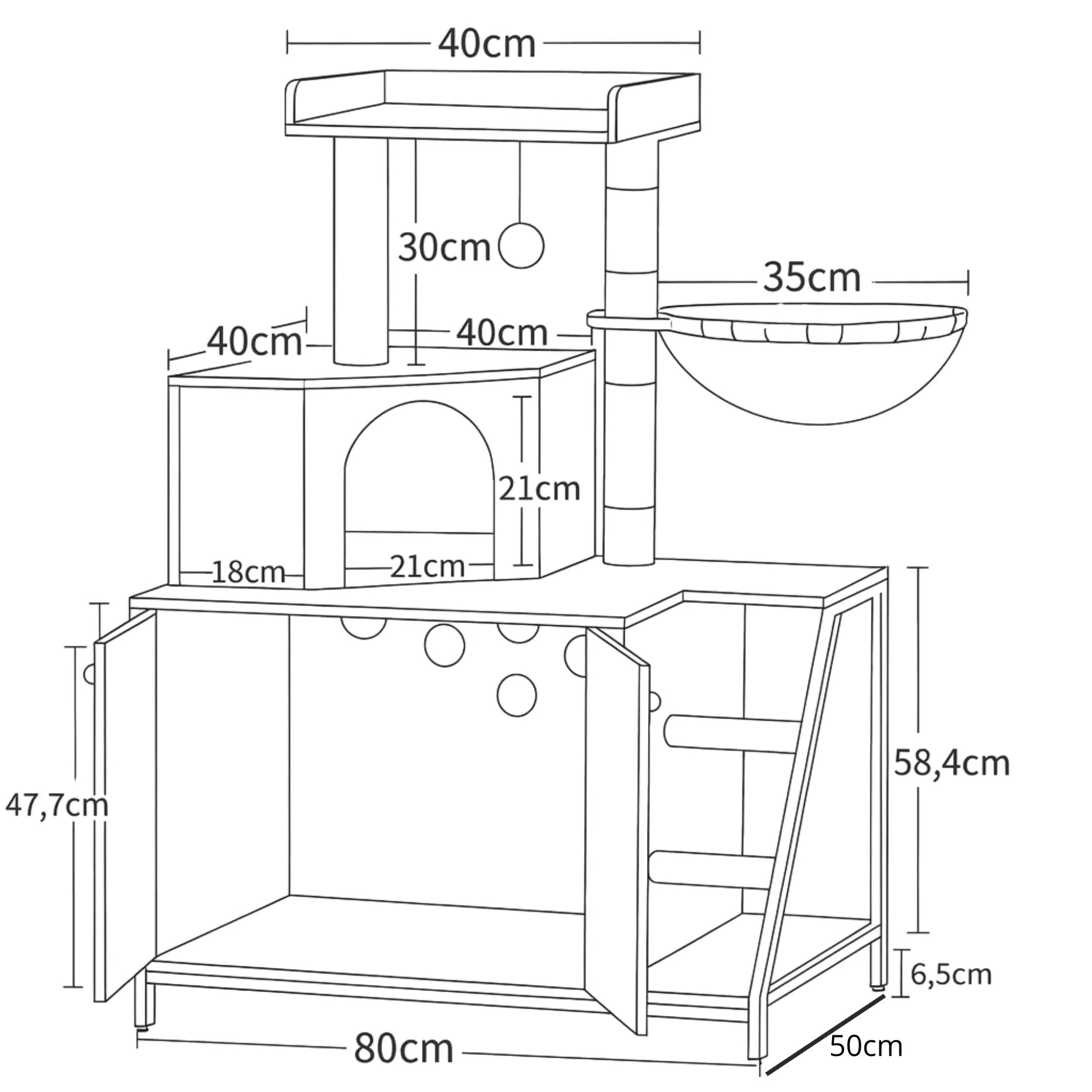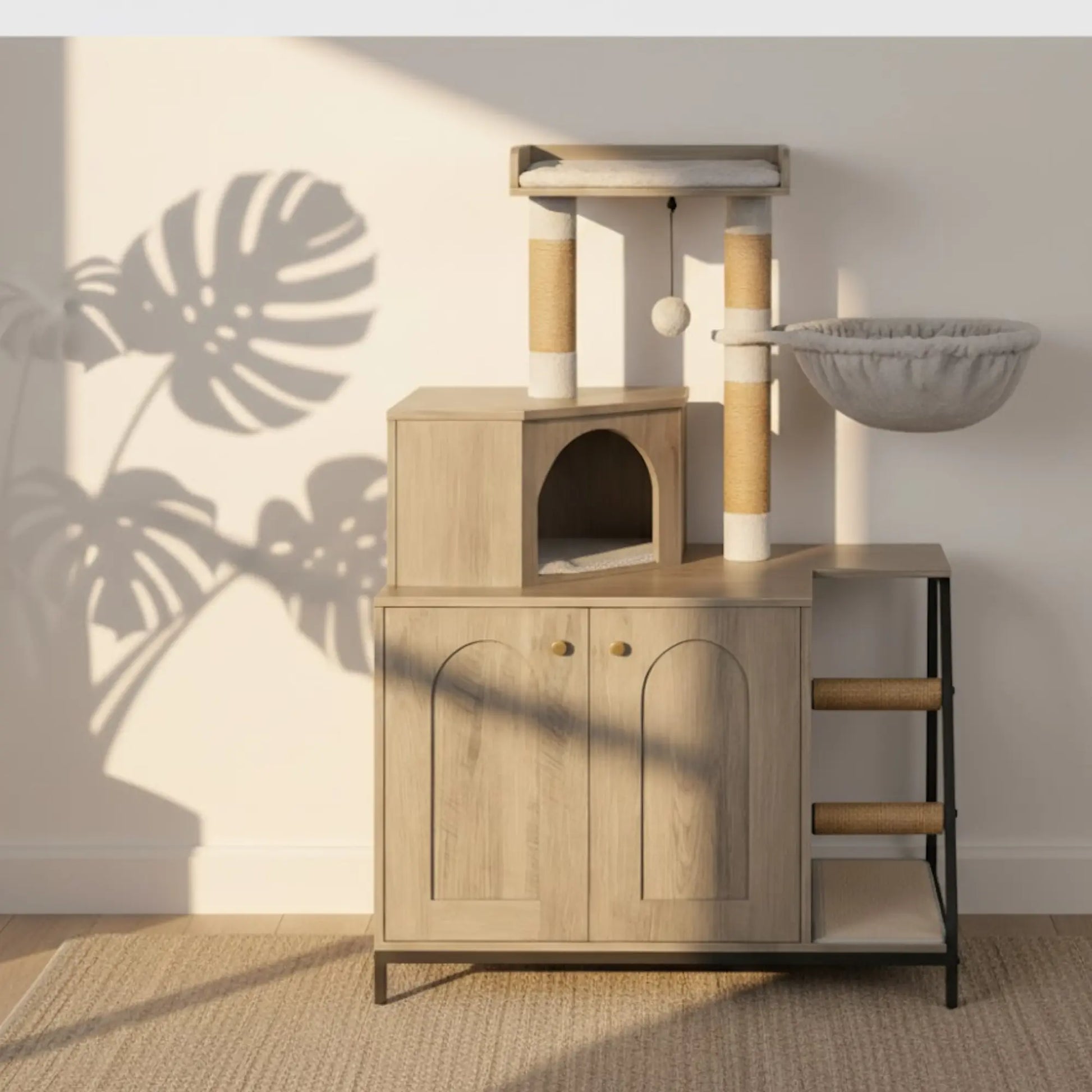 Offrez à votre chat un espace de vie tout-en-un, à la fois design, pratique et stimulant. Ce meuble 3-en-1 combine une maison pour bac à litière dissimulé, un arbre à chat avec plateformes, un griffoir en sisal naturel et un hamac suspendu ultra-confortable. Sa structure verticale en bois clair et métal noir s'intègre parfaitement à votre intérieur tout en optimisant l'espace. L'armoire basse offre un compartiment fermé pour cacher le bac à litière, assurant un environnement propre et sans odeur. Votre félin pourra grimper, se percher, jouer et se détendre dans un espace robuste et bien pensé, favorisant son bien-être et réduisant l’encombrement dans votre maison.
