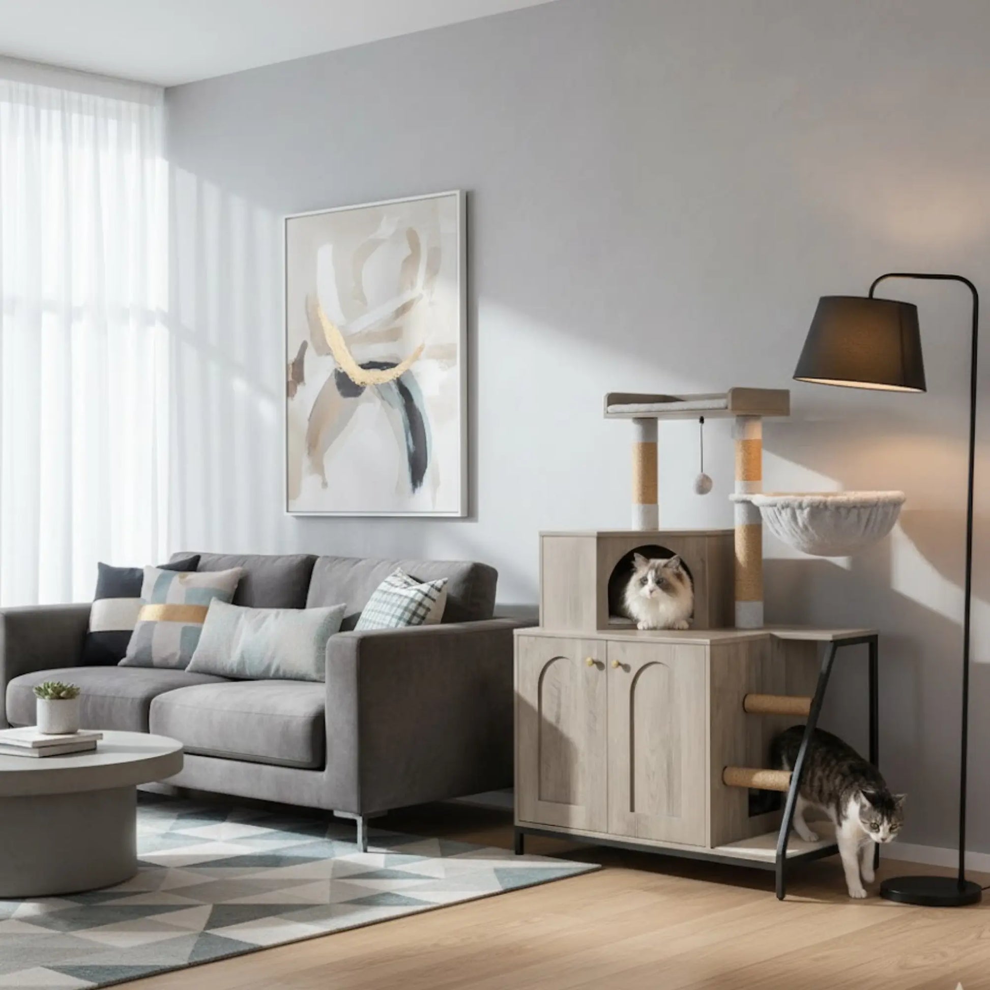 Captez les regards avec ce meuble 3-en-1 au design scandinave épuré. Il s’intègre parfaitement dans votre intérieur moderne, tout en offrant un espace privé à votre chat. Fini les bacs disgracieux : cette armoire est élégante, discrète et fonctionnelle. Votre félin s’y sentira en sécurité tout en ajoutant du style à la pièce.
