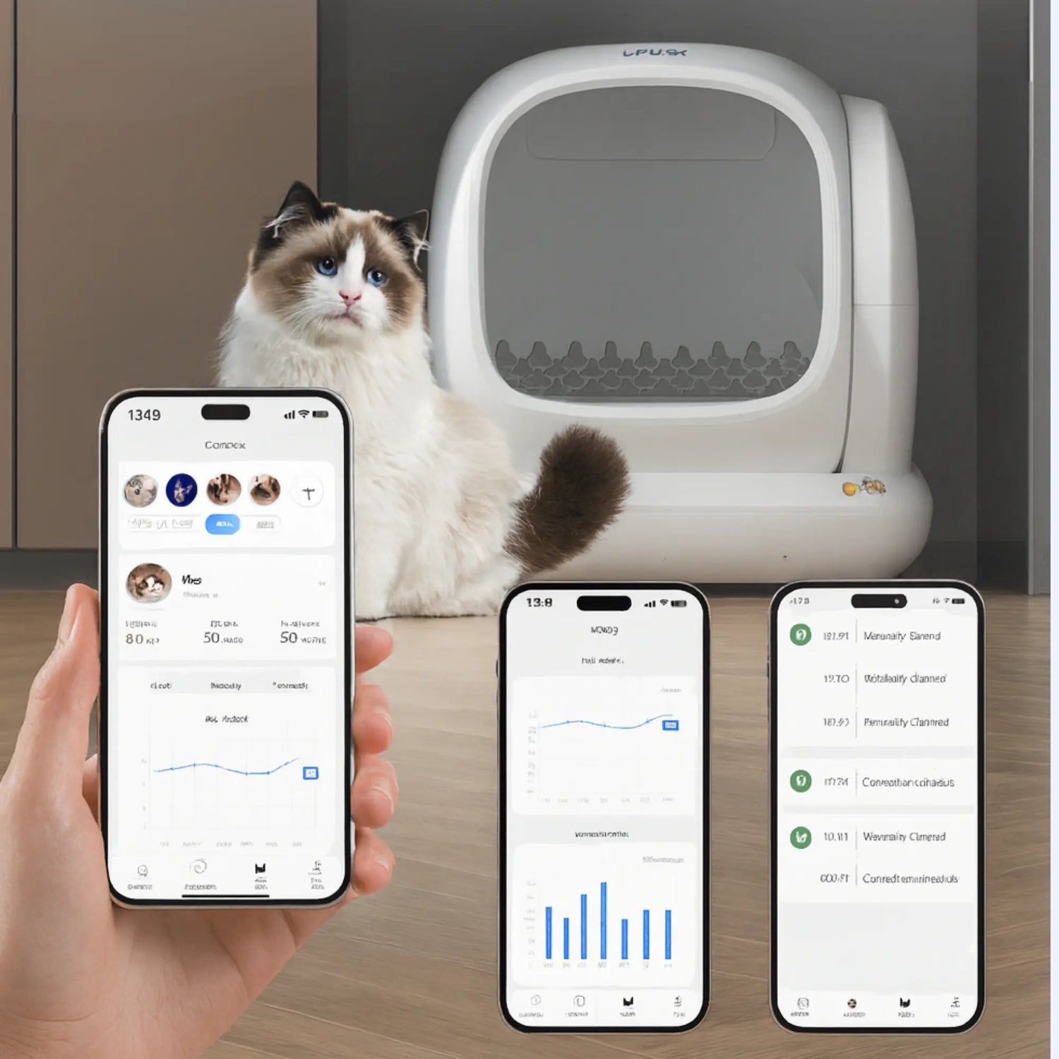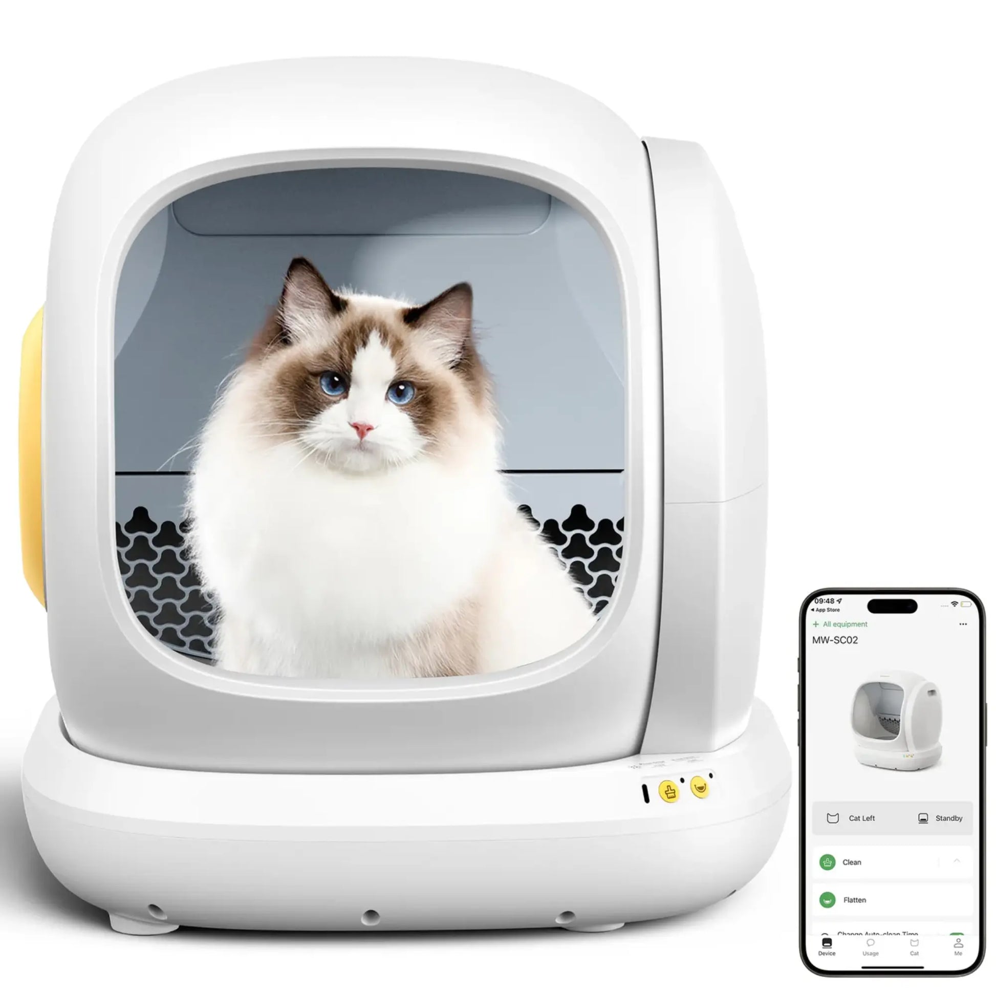 L'application (disponible sur iOS et Android) permet de suivre les habitudes des chats en temps réel, de contrôler à distance les modes de nettoyage, de surveiller le niveau de litière, et d’activer les fonctions selon vos besoins (nettoyage immédiat, nettoyage programmé, mode silence…).
